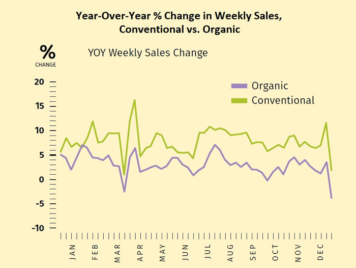 Packaged salads, an organic produce mainstay, also had similar results across all four regions, declining in volume by mid-single digits and increasing in sales by low single digits, closely reflecting the performance of the overall organic produce category.