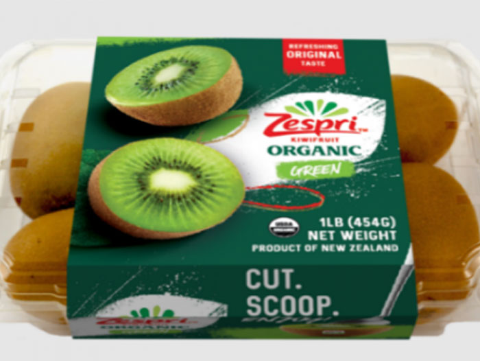 The recalled organic green kiwifruit is grown in New Zealand, exported to North America and repacked locally for sale in one-pound clear plastic clamshells bearing the Zespri brand and UPC code 8 18849 02009 3, containing fruit stickered with the GTIN bar code 9400 9552.