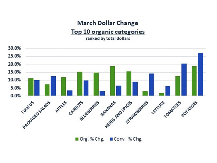Unprecedented consumer purchasing behavior across the United States because of COVID-19 emptied store shelves, resulting in widespread out-of-stock conditions. In March, total organic dollars were up 22 percent from March of last year and significantly above the dollar increase of January and February of this year, which stood at 1.8 percent. March 2020 organic sales were $546.8 million, with first quarter organic fresh produce sales at $1.582 billion.