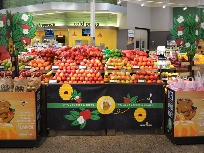 The unique alignment between Honeybear Brands and Cub comes to life in-store with displays that raise awareness about the importance of honey bee pollination and help consumers connect the dots between honey bees and apples. In fact, the work that a healthy hive of honey bees does to produce one pound of honey also results in the pollination of 1,000 apples!