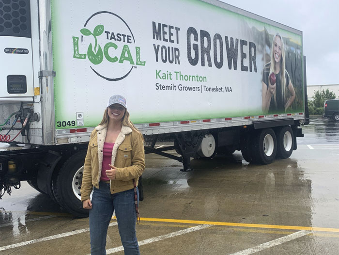 WENATCHEE, Wash. – As a part of its Taste Local campaign, Peirone unveiled a new truck trailer featuring 4th generation orchardist, Kaitlyn Thornton, to drive awareness about the growers behind its products during a retailer meeting on June 9. Peirone President and CEO, Mike Kamphaus, strives to help customers share the story behind locally grown produce with consumers in the Northwest.