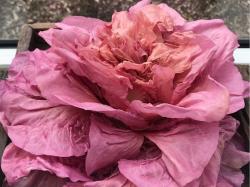 It’s Radicchio del Veneto — also called La Rosa del Veneto — a pink chicory mostly grown in the Veneto region of Italy but now cultivated in California, Pennsylvania, and elsewhere. While everyday radicchio (the Italian word for chicory) is available year-round, many more complex varieties emerge in the late winter and early spring. The radicchio is “forced,” meaning it’s grown for a certain amount of time and harvested in the fall, replanted, and grown in the dark, often covered by sand, so sunlight doesn’t reach the stem.