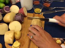 Potatoes USA was first on stage for presentation and demonstration. Its in-house chef taught the Hasselback cutting technique for a Russet potato. By placing two chop sticks (or wooden spoons) below the potato as a brace, you can cut thin slices lengthwise along one side of the potato — leaving the slices to fan out as they cook. Add seasonings, sauces or spices as a topping for unique flavor and stellar presentation.
