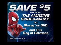 On Tuesday, August 19, 2014, The Amazing Spider-Man 2 will be released on Blu-Ray™ Combo Pack and DVD. Specially marked Green Giant® Fresh 5 lb. Russet Potato consumer bags will carry a $5.00 off instant redeemable coupon, usable when both the DVD and the potatoes are purchased together. These specially marked packages will be distributed starting mid-August with a coupon expiration date of October 31, 2014.