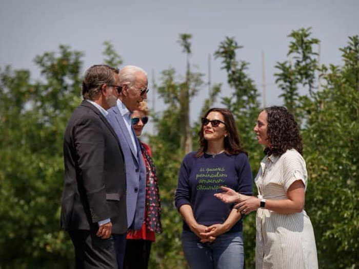 (Photo caption: President Biden, Sens. Peters and Stabenow and Gov. Whitmer discuss challenges facing growers with USApple member Julliette King McAvoy of King Orchards in Central Lake, Mich.; Photo Credit: @bethpricephotography)