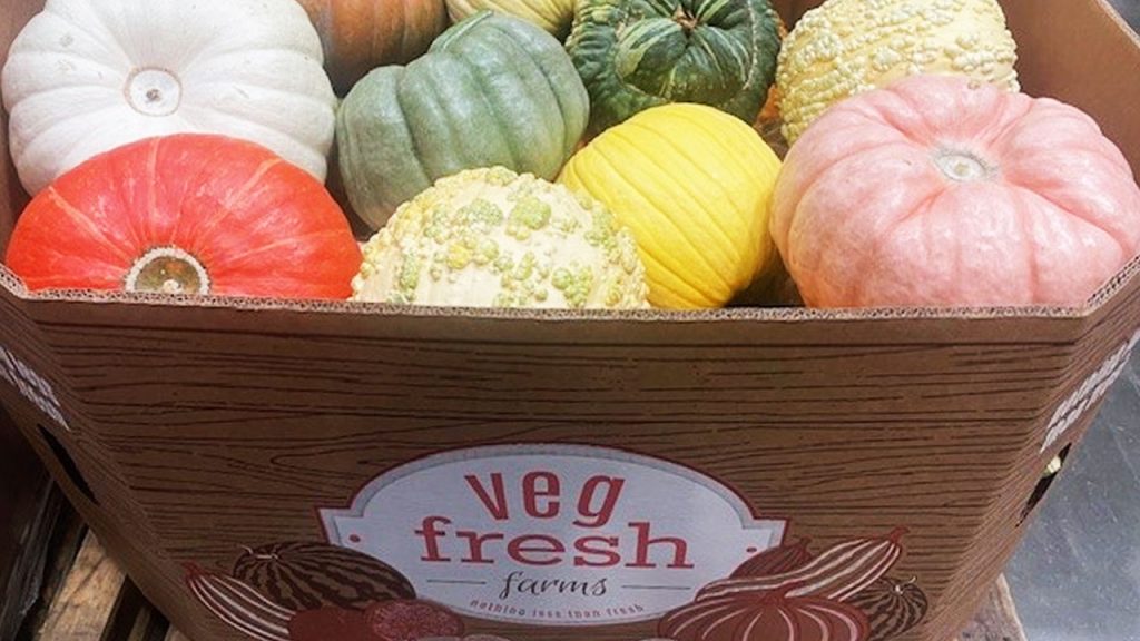 Veg Fresh Farms’ innovative approach includes offering creative, specialized mixes—like the popular Autumn Mix Bin—featuring sought-after heirloom pumpkins such as the Blue Doll and Marina di Chioggia, along with other unique varieties.
