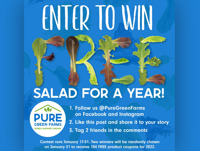 SOUTH BEND, IN – Pure Green Farms is running a 2-week long social media contest on Facebook and Instagram, where consumers can enter to win a year’s supply of lettuce. The contest itself was designed to increase brand awareness and establish brand loyalty within existing Pure Green Farms customers.