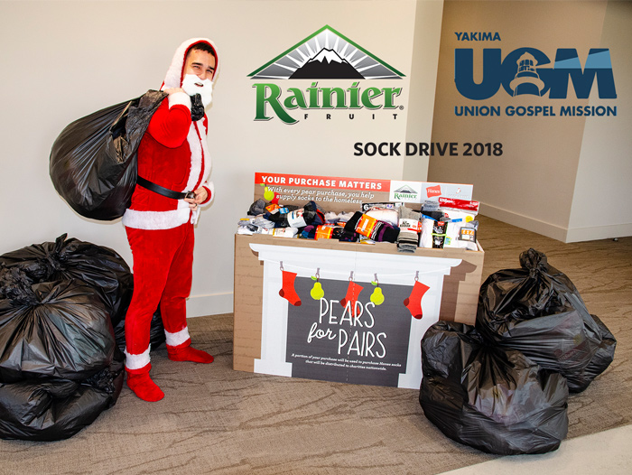 Selah, WA – The holiday season was a little brighter for some folks in the Yakima area thanks to the efforts of Rainier Fruit. As part of their Pears for Pairs national marketing campaign benefiting homeless charities, the staff at Rainier Fruit pitched in to make a difference not just nationally, but also at home, raising over $1300 during a holiday dessert auction and coming together to donate hundreds of pairs of socks and towels to the Union Gospel Mission in Yakima, WA.