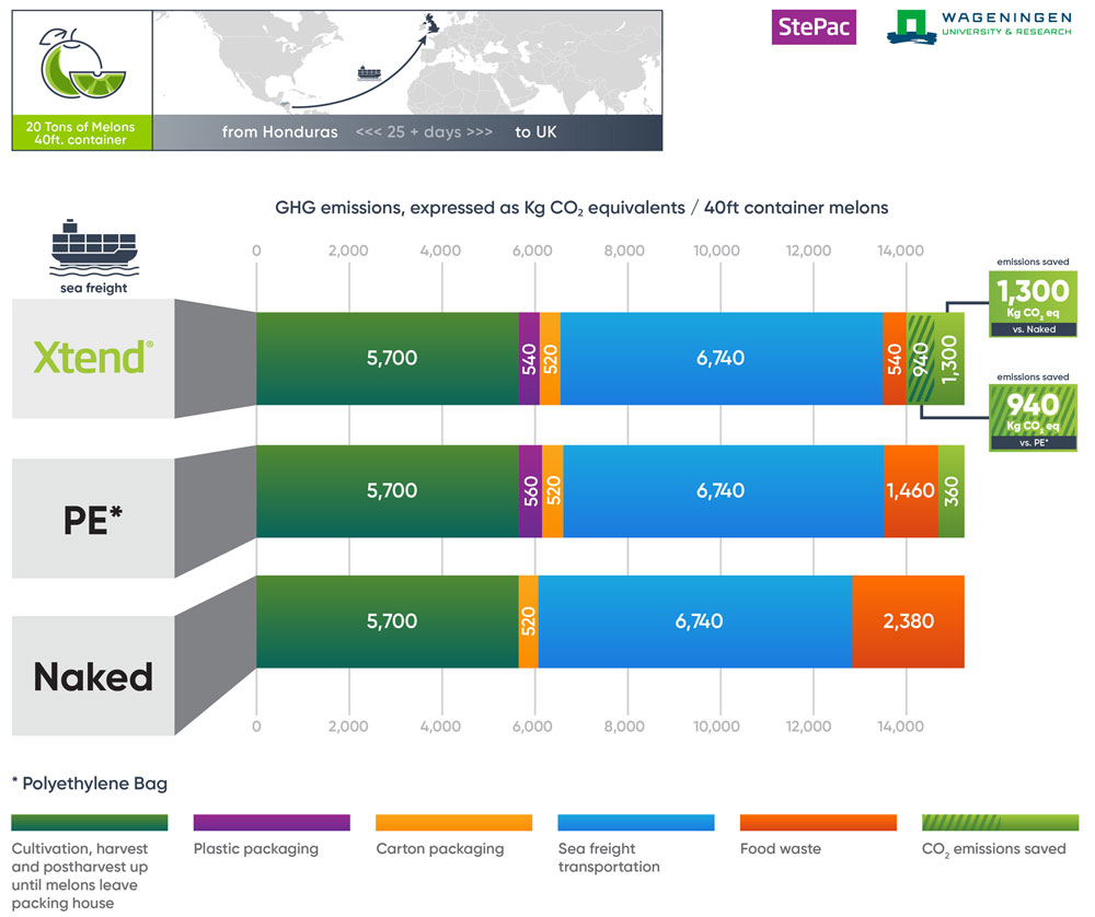 In one example, shipping unwrapped Galia and Cantaloupe melons from Honduras to the UK in 25+ days, resulted in a high waste of nearly 18%. Due to its low water-vapor transmission rate (WVTR), polyethylene packaging with MAP properties is unsuitable and can result in waste levels of 12.5% or greater, mainly due to microbial decay. The use of Xtend packaging with relatively high WVTR levels that eliminate excess moisture plays a key role in reducing the waste in sea freight to a minimum of less than 3.5%. This reduction in waste, when compared to polyethylene packaging, represents a reduction in 6% of the GHG emissions or 940kg CO2 equivalents per container loaded with 20 tons of melons. In tangible terms, shipping four containers of melons in Xtend saves the equivalent annual CO2 emissions produced by an average vehicle, estimated at 3020 Kg.
