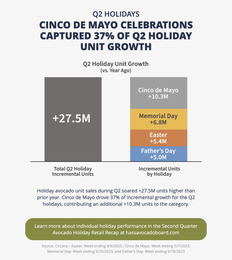 MISSION VIEJO, CA – Spring and summer holidays generated higher avocado unit sales compared to 2022 according to the recently released holiday retail recap report from the Hass Avocado Board (HAB). Easter, Cinco de Mayo, Memorial Day, and Father’s Day contributed a combined 27.5M incremental avocado units versus the prior year. Avocado volume during Cinco De Mayo grew by 37% vs. the prior year, adding +10.3 million units to the category during the holiday week. The retail recap reported sales volume and retail dollar holiday sales reached 182.7 million units and $194.9 million during the second quarter.