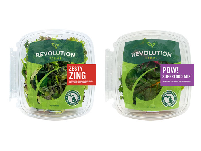 GRAND RAPIDS, Mich. – Revolution Farms, a leading indoor greenhouse farm in Michigan, is launching four new products in independent grocery stores in the Detroit Metro area and West Michigan this month, including three bold salad mixes and a whole head, living lettuce. The three new salad mixes include: BAM! Baby Kale, POW! Superfood Mix and Zesty Zing Salad Mix, bringing the Michigan farm’s total number of packaged salad mixes to seven.