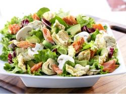 “Joan’s Salad” rounds out the winning salads with spring mix, artichokes, avocados, mushrooms, and fresh salmon topped with rice crisps.
