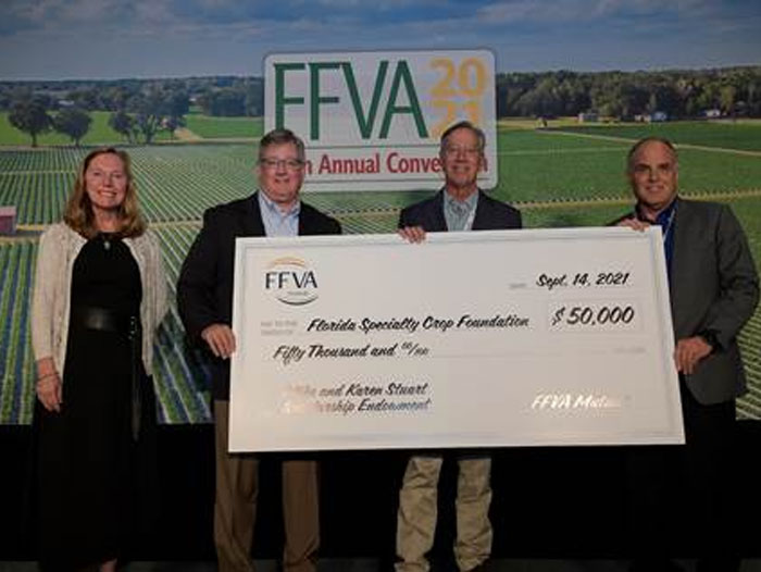 MAITLAND, Fla. – The Florida Fruit & Vegetable Association (FFVA) and the Florida Specialty Crop Foundation (FSCF) recently received a $50,000 donation from FFVA Mutual Insurance Co. to fund the Mike and Karen Stuart Scholarship. The donation was announced during FFVA’s 77th annual convention in Naples on Sept. 14.