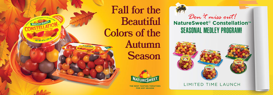 Add a dash of fall-time to mealtime with NatureSweet’s latest launch: Constellation Fall Seasonal Medley! Seasonal Medleys offer a colorful path into the world of small tomatoes. And they’re also perfect for promoting Halloween and Thanksgiving. NatureSweet will complement in-store support with online recipes, and contests. https://naturesweet.com/