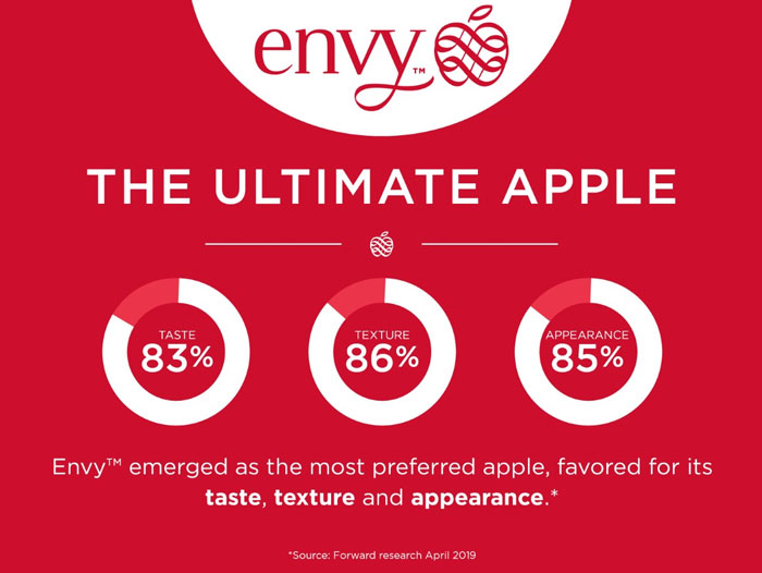 Regarding texture, Envy™ emerged as the most crisp, firm and juicy, in addition to participants favoring the size, shape and interior flesh appearance of Envy™; which naturally stays whiter longer.