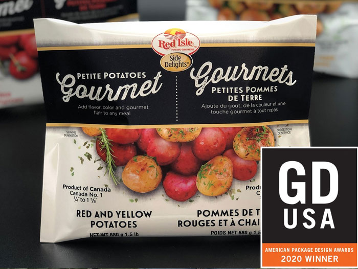 Side DelightsÒ Gourmet Petites for Canada are high quality, petite Red, Yellow, and combination Red and Yellow potato varieties. These potatoes come in a 1.5-pound pillow pack. “We launched this design in Canada with our Red Isle Potato Growers partner. Canadian retailers want a product line that communicates an elegant, high-end offering for the gourmet segment of the potato category,” noted Triou. “Typically, bi-lingual packaging struggles design-wise. For this type of package to win a visual design award is unique. With this recognition, I feel confident extending this design to the continental U.S.”