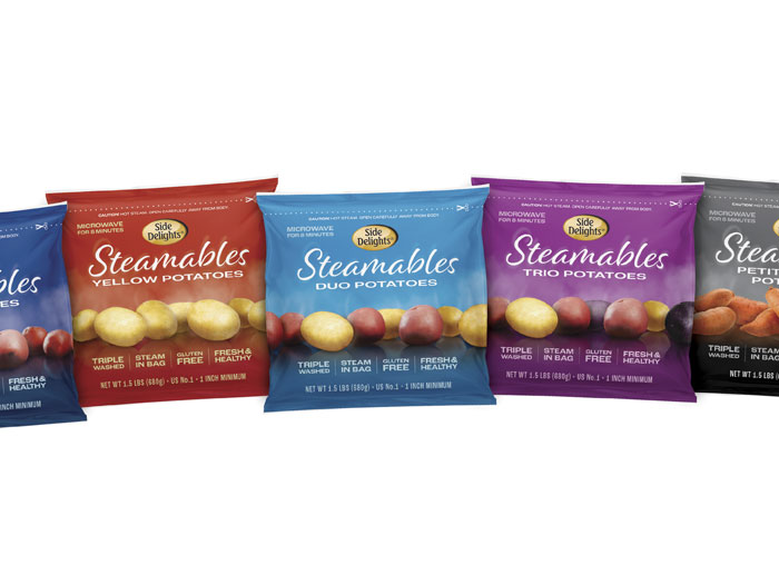 The new Steamables line was updated with design queues from its popular Side Delights 5lb. bag design. It includes color blocking to visually guide shoppers to find the potato type they seek, contrasting colors between the bag and the potato to brighten the display and invite potato-type exploration. We created a bold, clean, contemporary design to convey critical facts and messaging. The updated packaging is available for the complete line of Steamables potato types: Red, Yellow, Duo, Trio, Sweet Potato, and Fingerling.