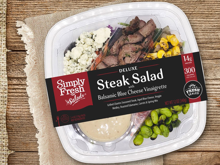 The new innovation from FiveStar is a Steak Salad with Balsamic Blue Cheese Vinaigrette and is the latest in a long history of flavorful and portable single serve offerings under its Simply Fresh brand. The DELUXE Steak Salad features grilled Cilantro seasoned steak, aged blue cheese, vegetable medley, roasted edamame and carrots with an in-house made Balsamic Blue Cheese Vinaigrette all complimenting a generous portion of fresh, tasty Spring Mix.