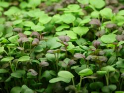 “Microgreens” is a marketing term used to describe tiny, tender, edible greens that germinate in soil or a soil substitute from the seeds of vegetables and herbs. Smaller than “baby greens,” and harvested later than “sprouts,” microgreens can provide a variety of leaf flavors, such as sweet and spicy. They are also known for their various colors and textures. Among upscale markets, they are now considered a specialty genre of greens that are good for garnishing salads, soups, plates, and sandwiches.