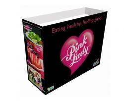 To highlight both the health attributes of Pink Lady apples and their many culinary uses, Stemilt created a pop-up display bin for the apple back in 2010. The same black-and-pink display is back by popular demand for 2011 promotions. Pink Lady America’s well-known Flowing Heart™ logo appears across the front of the display along with the catchy slogan ‘Eating healthy, feeling good.’ On the side of the display, Stemilt placed three delicious recipes and health messages. Each display holds up to 80 pounds of bulk fruit or multiple bags. Corresponding POS cards are included with each display to further merchandise the apples in the produce department.