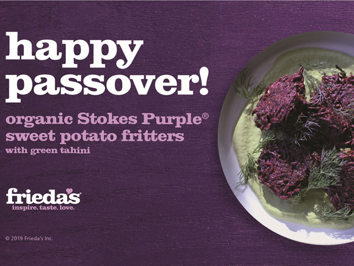 “We know that shoppers will be looking for exciting Passover items at their local markets so we want to make it easier for them to find these holiday must-haves through merchandising. Try cross-merchandising horseradish and Stokes Purple® sweet potatoes as a way to increase the basket ring during this springtime Jewish holiday.” says Alex Berkley, sales manager at Frieda’s.