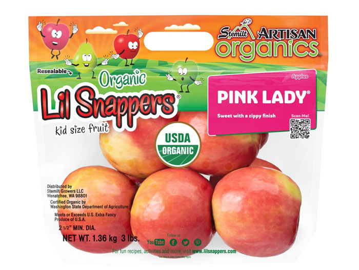 Lil Snappers® kid size fruit is available in multiple organic varieties, including Gala, Pink Lady®, Granny Smith and Fuji – all varieties popular among young consumers. Artisan Organics™ Lil Snappers® are available in 3lb high graphic pouch bags that stand out among other packaged products and stand up in the fridge to help maximize fridge space.