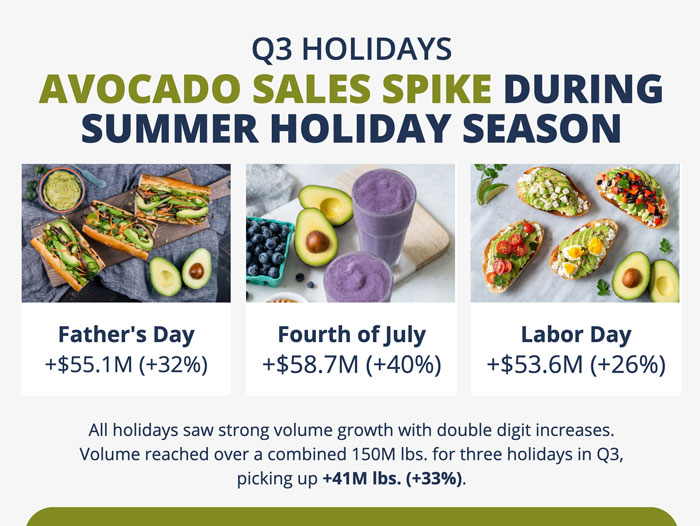 MISSION VIEJO, CA – Summer avocado sales continued to grow as shoppers purchased a record number of fresh Hass avocados in celebration of dad, 4th of July, and the start of a new school year. The Hass Avocado Board’s recently published Q3 holiday recap report indicates that Father’s Day, the 4th of July and Labor Day holidays all reached four-year highs. The report is insightful for retailers and industry leaders to use the information as they plan promotions for the upcoming year and look for new opportunities for avocado sales growth.