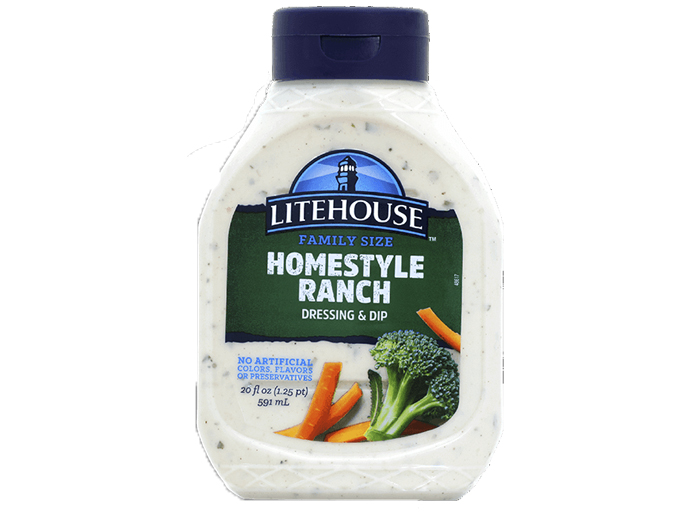 • Homestyle Ranch Dressing & Dip: Dunk it, dip it, or spread it. Litehouse Homestyle Ranch is a delicious, creamy blend of sour cream, buttermilk, fresh herb and vegetable flavors that will dress up any party. Enjoy it in a shareable 20 oz. Family Size squeeze bottle, 13 oz. jar or 12 oz. dip tub that’s perfect for on-the-go.