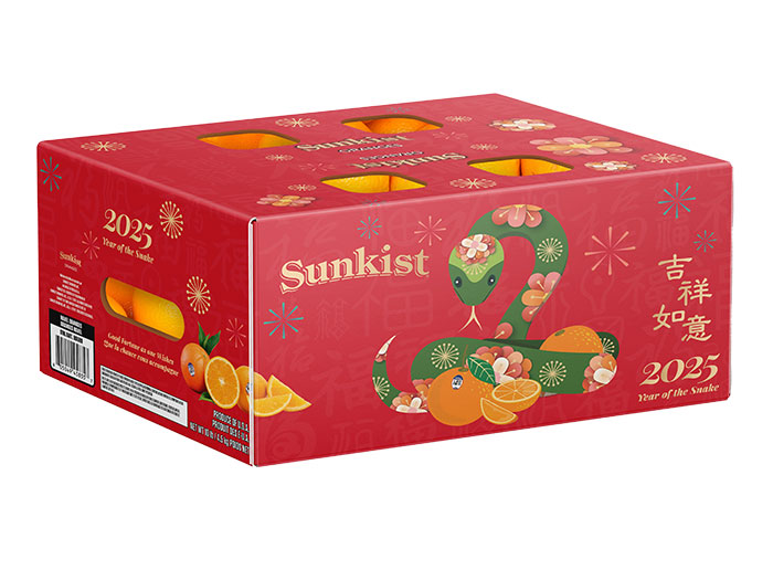Valencia, Calif. – Sunkist Growers, Inc., North America’s longest-standing citrus cooperative and one of the most recognized brands at retail, is proud to unveil its newest packaging design to commemorate the Lunar New Year holiday, which begins on January 29, 2025, marking the Year of the Snake. The specially designed 10lb cartons are versatile, holding Navel or Cara oranges, while the matching display bins can hold a variety of in-season citrus, including Pummelos, the perfect big impact purchase to celebrate festivities.