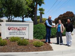 CASTROVILLE, Calif. – Mark Reasons, facility manager and member Ocean Mist Farms’ board of directors, receives a rebate check for $58,683 from PG&E Salinas representatives Charlene Iwata, customer and community relations, and Rob Cruz, senior customer relations manager, for savings generated by sustainability efforts at the Ocean Mist Farms cooling facility located at company headquarters.