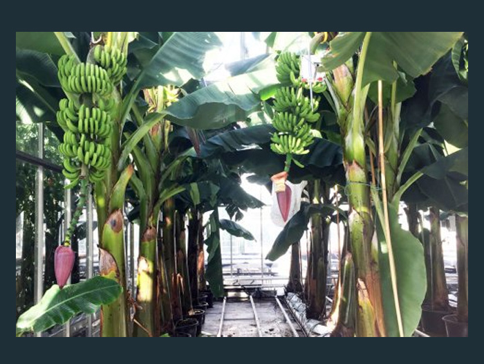 In the greenhouses of the experimental farm Unifarm in Wageningen a unique research experiment has been carried out since January. Bananas grow in the greenhouse in pots and on a substrate, both artificial media for plant growth. “For the 100th anniversary of WUR, we developed this plan together with the local cooperation Boerenhart: the cultivation of a regional banana in the Wageningen greenhouses,” says Professor of Tropical Plant Pathology Gert Kema. “With this experiment we will investigate whether this cultivation offers prospects for further research into mastering Fusarium wilt. This is due to a soil borne fungal pathogen that threatens the banana production throughout the world. So we took the banana out of the soil.”