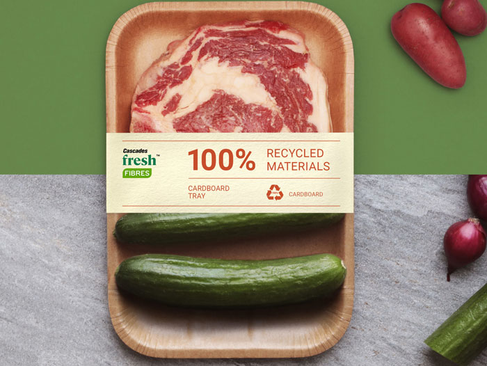 This Cascades FreshTM product was launched in September 2020 with the goal of packaging fresh food in an efficient, environmentally friendly way. Its design has been rigorously tested to adapt to automated equipment without impacting their performance. This thermoformed tray delivers a unique innovative food packaging solution that was developed entirely using a circular economy approach and ecodesign principles. The tray is composed of 100% recycled fibres, mostly sourced from post-consumer sources certified “Recycled” under the Forest Stewardship Council® (FSC®) standard.1 In addition, it is designed with a SurfSHIELDTM water-based coating that protects it from moisture without compromising the recyclability of the cardboard. Unlike traditional containers coated with a thin layer of plastic or other non-recyclable coatings, this food tray is easily recyclable and can be placed in the recycling bin.