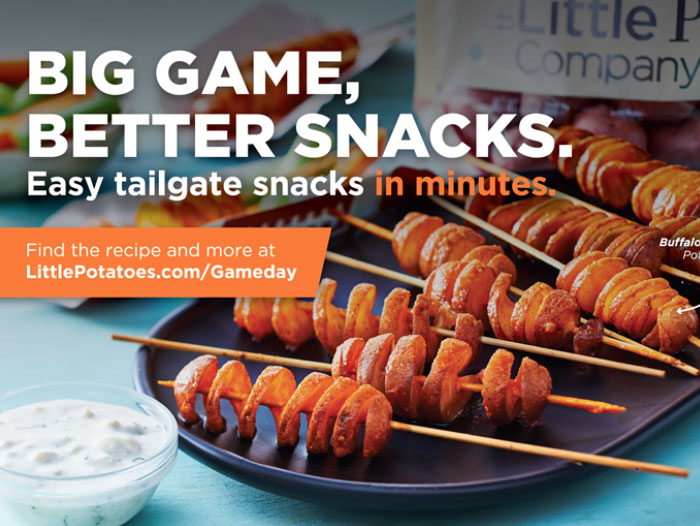 The promotion will highlight game day worthy ways to enjoy The Little Potato Company 1.5 lb bagged potatoes, Microwave Ready and Oven|Grill Ready products and will help drive retail sales and foot traffic during one of the biggest days for eating and snacking.