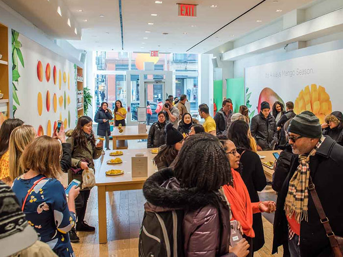 The Mango Store opened its doors on Thursday, March 7 on a bustling street corner in Manhattan, NY. During the days immediately prior, the storefront was showcased on a digital billboard in Times Square and on social media to build excitement. The entire store was strategically designed, with bright, eye-catching colors to draw visitors inside to escape the cold and in-store experiences to stimulate all five senses with mango inspiration. Upbeat Mango Associates encouraged guests to interact with displays and shared mango education, while dance worthy beats of “Juicy Mango Jams” set the mood. Signage displayed key education facts such as “It’s Always Mango Season”, how-to-cut a mango and mango nutrition information. The store showcased mango varieties, mouthwatering mango dishes and drinks, a wall of mango innovation and an interactive photobooth. Celebrity influencers and guests shared the exciting experience across social media.