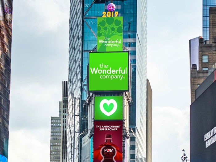 The Wonderful Company, known for its healthy, iconic brands such as FIJI Water, POM Wonderful and Wonderful Pistachios is once again taking the spotlight at the One Times Square digital billboards in the heart of New York City now through October 2019. The parent company known as The Wonderful Company, and its popular brands Wonderful Pistachios, POM Wonderful, FIJI Water, and JNSQ Wines will be spotlighted together for the first time for the entire month of June, with additional brands from The Wonderful Company rotating in throughout the coming months through fall 2019. Wonderful Halos mandarins, America’s most-loved healthy snack brand ranked among parents and kids (according to a 2018 Brand Love study) are among the brands that will begin appearing on the billboards starting this fall. The One Times Square billboards are located at one of the most visited tourist attractions in America, which draws an estimated 380,000 pedestrian visitors a day.
