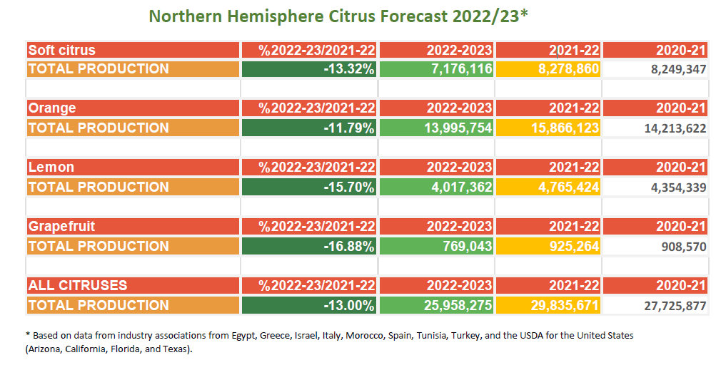 The World Citrus Organisation (WCO) has released its annual Northern Hemisphere Citrus Forecast for the upcoming citrus season (2022-23). The Forecast, which was presented during the third edition of the Global Citrus Congress on 30 November 2022 online, is based on data from Egypt, Greece, Israel, Italy, Morocco, Spain, Tunisia, Turkey, and the United States. This year the Forecast shows that citrus production is projected to reach 25,958,275 T, which represents a 13% decrease compared to the previous season.