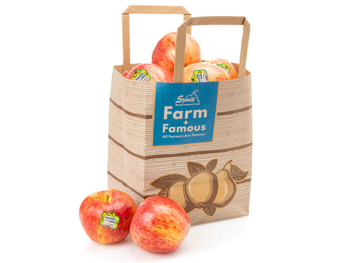 The Farm + Famous Tote Bag program is a grab-and-go pack to help sell bulk apples. It’s a paper tote bag packed in a display-ready Euro with an earthy design. It can be instantly displayed at retail, while still meeting the consumer demand for sustainable packaging. Each Euro holds eight 4lb. bags that are made from 100% recyclable material. Retailers will use the PLU sticker on the fruit to ring up the bag.