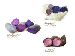 Purple sweet potatoes, however, are more commonly available to most consumers. Stokes Purple® sweet potatoes have purple-tinted skin and violet-purple flesh; Okinawan sweet potatoes have beige skin and lavender-purple flesh.