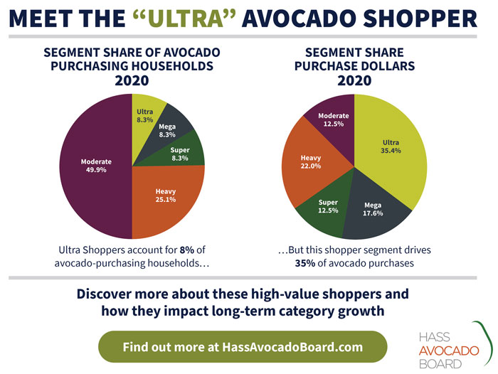 A recent avocado shopper segmentation study by the Hass Avocado Board (HAB), available for free download on hassavocadoboard.com/business-support-tools, determined that a small subset of avocado-purchasing households, known as Ultra shoppers, make the most significant impact on the category. Ultra shoppers were found to be the top-spending segment, making up eight percent of avocado buying households. However, this segment accounts for 35% of the total U.S. annual avocado purchase dollars. Ultra shoppers exhibit purchase behaviors that far exceed that of other segments, driving their disproportionate impact on the avocado category.