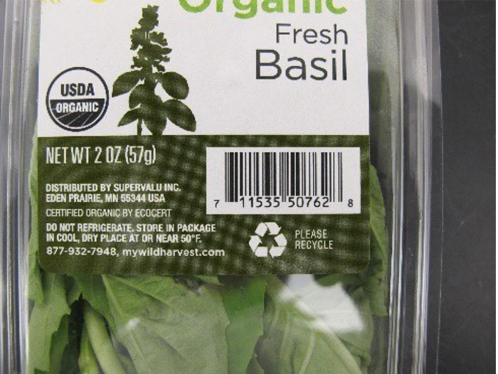 This recall includes Wild Harvest® Organic Fresh Basil products sold in .25oz, .75oz, 2oz, and 4oz plastic clam shell containers (UPCs: 0071153550450, 0071153550322, 0071153550762, 0071153550323). Impacted product can be identified by a white sticker with black ink on the back of the container stating: “Product of Colombia” and “112.”