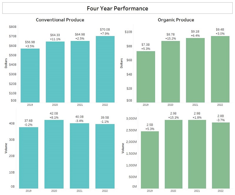 “In an inflationary time like this, we expect to see the growth of sales dollars and volume declines repeated for the majority of organic and conventional fresh produce items,” said Tom Barnes, President of Category Partners. “The average conventional price per pound grew by 9.2 percent compared to 2021 while organic produce price per pound rose by 7 percent. With rising prices, we may see more selective organic shopping from consumers as they substitute higher-priced organic items for conventional ones.”
