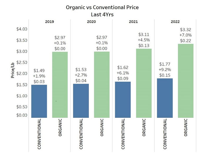 Organic fresh produce prices in aggregate remained substantially higher than conventional, with 2022 showing the price gap between conventional and organics the largest it has been in the past four years at $1.55 per pound. “In an inflationary time period, it is important for organic producers to understand how their pricing impacts behavior among various consumer segments and to reach those consumers with the health and value benefits associated with organics,” said Barnes.