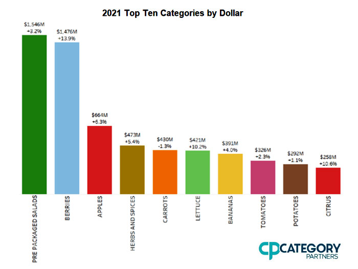Three categories—packaged salads, berries, and apples—accounted for two-thirds of all organic fresh dollar growth in 2021 compared to 2020. Despite organic berries’ large year-over-year dollar increase, packaged salads were again the number one organic fresh produce category by total sales, topping $1.5 billion.