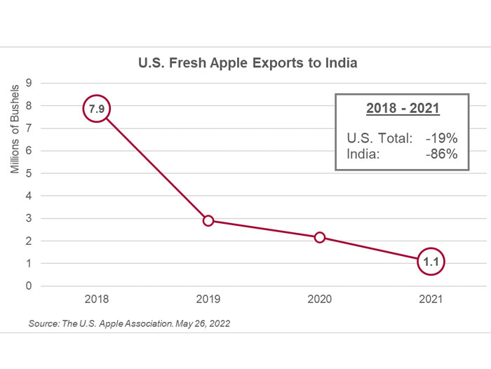 Prior to the retaliatory tariffs, India had been a promising growth market for U.S. apples. Exports to India the first nine months of 2017 more than doubled sales in 2016.The retaliatory tariffs by China on apples is also a significant concern as the U.S. apple industry had only gained full access to the market in 2015 and it was considered to have significant growth potential.