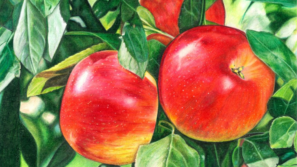 Entries from 9th to 12th grade students were received in a wide range of mediums, including colored pencils, acrylic paint, alcohol markers, watercolors, pastels, gouache paint, pencil, and oil paint. A panel of judges from the tree fruit industry carefully reviewed the artwork and selected the winners. In addition to artistic style, the judges were looked for apples representative of Washington’s world class fruit.