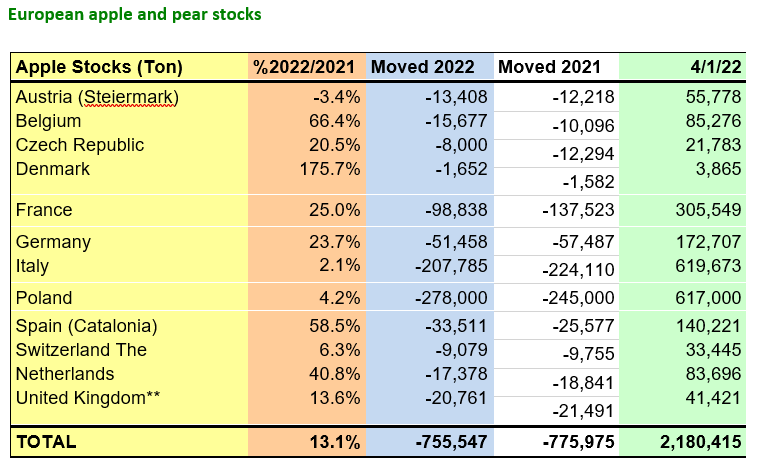 WAPA, the World Apple and Pear Association, collects every month the stock figures for apples and pears from Europe and the United States. WAPA can reveal that European apple stocks stood at 2,180,415 T as of 1 April 2022, which is 13.1% above the figure of 2021. This trend can be explained by the increases concerning Red Jonaprince (46.6% up from 2021), Jonagold (+38.6%), Gala (+33.8%), and Golden Delicious (+26%), although several varieties reported a decrease compared to 2021, including Gloster (-55.4%) and Granny Smith (-19.1%). On the other hand, pear stocks stood at 206,181 T on 1 April 2022, 24.6% below the volume of 2021. In addition to the Italian varieties almost being down to zero (Abate Fetel -99.8% and Kaiser -99.3% compared to 2021), Conference pears were also 13.1% down from last year.