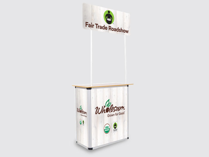 With the purpose to spread awareness and educate retail associates and consumers on the importance and impact of Fair Trade, Wholesum will hit the road to visit participating retail stops. In addition to meeting the Wholesum team and learning about stories of impact at Wholesum’s farming communities, produce department managers and staff will have the opportunity to become “Fair Trade Gurus” through an exclusive online quiz. The purpose is to empower associates to speak knowledgeably about Fair Trade and influence others to make informed purchasing decisions. Participants who take the quiz will receive a limited edition lapel pin and certificate recognizing their achievement. The roadshow will also include an in-store demo portion, where shoppers will find the Wholesum team at their Fair Trade Roadshow kiosk (see image) and sample organic, Fair Trade Certified product.