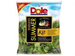 Introduced in April 2011, Endless Summer DOLE All-Natural Salad Kit pairs crisp romaine lettuce and crunchy shredded carrots with Swiss and Gruyere cheeses, oven-baked croutons, roasted sunflower kernels, dried herbs and Dole’s Own Summer Vinaigrette dressing. It is part of Dole’s ongoing commitment to all-natural salad kits, the industry’s first nationally distributed salad kit line to combine farm-fresh lettuces and vegetables with all-natural toppings and salad dressings.