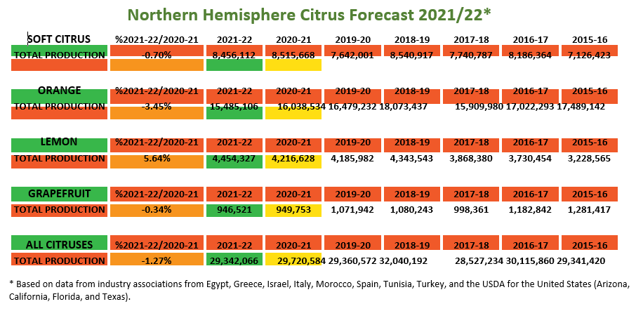 The WCO Secretariat has released its annual Northern Hemisphere Citrus Forecast for the upcoming season (2021-22). The preliminary Forecast is based on data from industry associations from Egypt, Greece, Israel, Italy, Morocco, Spain, Tunisia, Turkey, in addition to the United States (based on USDA reports for Arizona, California, Florida, and Texas). Philippe Binard, Secretary General of WCO stated: “The Forecast shows that the 2021-22 Northern Hemisphere citrus crop is projected to reach 29.342.000 T, which represents a 1.27% decrease compared to the previous season”.