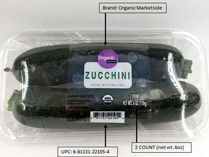 Recalled Organic Marketside Zucchini can be identified by the following descriptions: